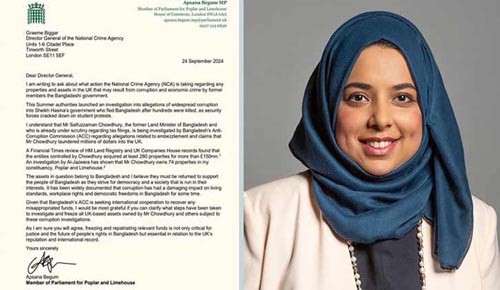 আন্তর্জাতিক ডেস্ক: শেখ হাসিনা সরকারের দুর্নীতির তদন্তে ব্রিটিশ বাংলাদেশি এমপি আপসানা বেগম এবার সরব হয়েছেন । ২৪ সেপ্টেম্বর তিনি ব্রিটেনের ন্যাশনাল ক্রাইম এজেন্সির ডিরেক্টর জেনারেল গ্রীম বিগারকে একটি চিঠি দিয়ে আহ্বান জানিয়েছেন শেখ হাসিনা সরকারের মন্ত্রী যাদের বিরুদ্ধে ব্রিটেনে অর্থ পাচারের অভিযোগ রয়েছে সেগুলো তদন্ত, ব্রিটেনে অর্জিত সম্পদ স্থগিত করা, অপরাধীদের আইনের আওতার আনার জন্য।