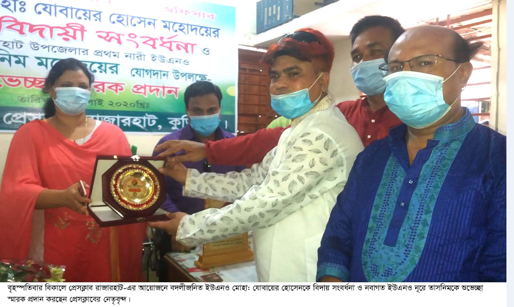 বৃহস্পতিবার বিকালে প্রেসক্লাব রাজারহাট কার্যালয়ে প্রেসক্লাবের সভাপতি এস এ বাবলুর সভাপতিত্বে এবং সাধারণ সম্পাদক মো: রফিকুল ইসলামের সঞ্চালনায় সভায় বক্তব্য রাখেন বদলিজনিত ইউএনও মোহা: যোবায়ের হোসেন, নবাগত ইউএনও নূরে তাসনিম, উপজেলা সহকারী ভূমি কমিশনার মোছা: আকলিমা বেগম, প্রেসক্লাবের প্রধান উপদেষ্টা ও আওয়ামীলীগের সাধারণ সম্পাদক আলহাজ্ব আবুনুর মো: আক্তারুজ্জামান, উপদেষ্টা বাবু রামজীবন কুন্ডু, অধ্যক্ষ সফিকুল ইসলাম রানা, সদর ইউপি চেয়ারম্যান মো: এনামুল হক, প্রেসক্লাবের সাবেক সভাপতি সহকারী অধ্যাপক সাজেদুর রহমান মন্ডল (চাঁদ) প্রমূখ।