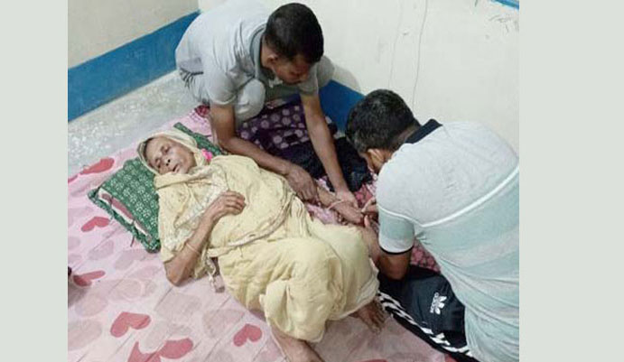 বর্তমানে নলচিড়া বাজারের একটি দোকানে আশ্রয় নিয়ে মানবেতর জীবনযাপন করছেন মা হালিমা বেগম (৮২)।