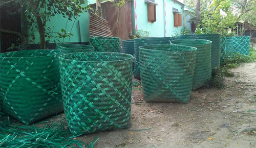 জামালপুরে গ্রামীন মহিলারা প্লাস্টিকের বেল্ট দিয়ে তৈরি করছে শস্যের ডোল