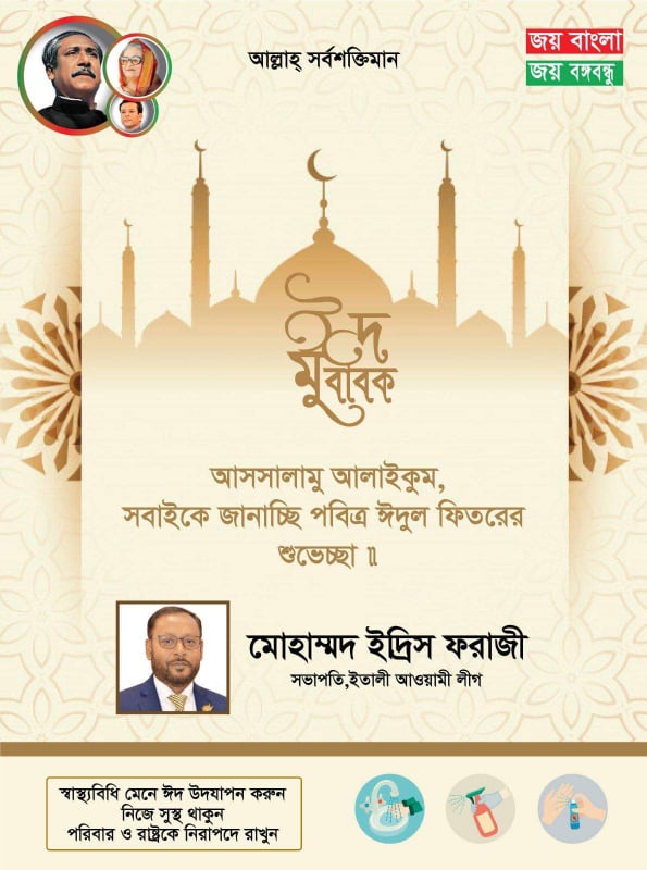 তিনি বলেন, বাংলাদেশ বাসী ও ইতালি প্রবাসীসহ আমার সকল আত্মীয়, স্বজন, বন্ধু, প্রিয়জন, নেতা, নেএী, শুভাকাঙ্ক্ষী সকল ভক্ত সহ সকলকে জানাই ঈদ – উল – ফিতর এর শুভেচ্ছা ও অভিনন্দন। ঈদ মোবারক।