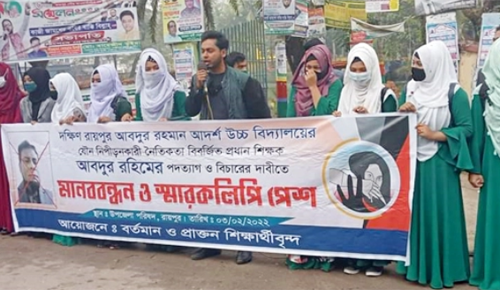 কয়েকজন ছাত্রী ও অভিবাবক জানান, বিদ্যালয়ের প্রধান শিক্ষক আবদুর রহিম কয়েক মাস ধরে নবম ও দশম শ্রেণির ছাত্রীদের মোবাইল ফোনে ও ফেসবুক ম্যাসেঞ্জারে অশ্লীল কথাবার্তা বলেন। যার স্ক্রিনশট ইতোমধ্যে ফেসবুকে ছড়িয়ে পড়েছে। এনিয়ে তারা শিক্ষকের বিচারের দাবি করলেও কোনো ফল আসছে না। এজন্য মানববন্ধন ও স্মারকলিপি দেওয়া হয়।