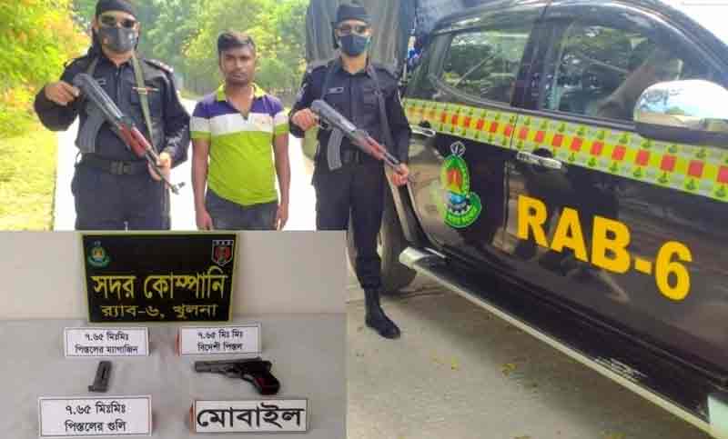 যশোর র্যাব জানায়, অস্ত্র বেচাকেনার গোপন খবরে, বেনাপোল পোর্ট থানার গয়ড়া গ্রামে অভিযান চালিয়ে পিস্তল গুলি ম্যাগজিনসহ তাকে আটক করা হয়।