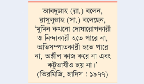 আবদুল্লাহ (রা.) বলেন, রাসুলুল্লাহ (সা.) বলেছেন, ‘মুমিন কখনো দোষারোপকারী ও নিন্দাকারী হতে পারে না, অভিসম্পাতকারী হতে পারে না, অশ্লীল কাজ করে না এবং কটুভাষীও হয় না।’ (তিরমিজি, হাদিস : ১৯৭৭)