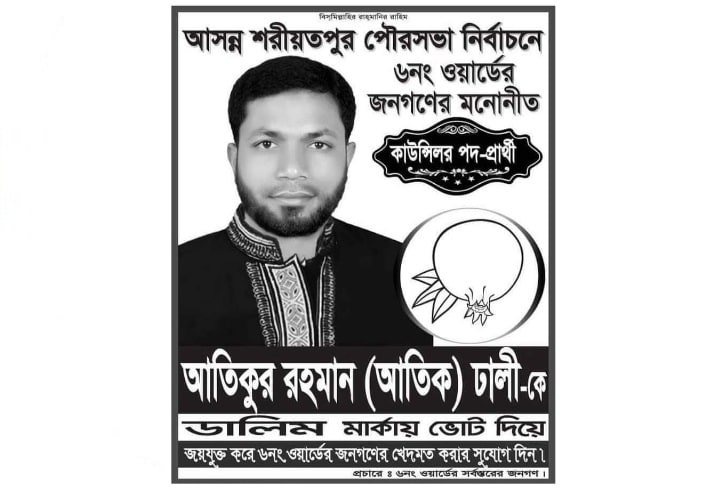 আসন্ন শরীয়তপুর পৌরসভার নির্বাচনে ৬নং ওয়ার্ডে মোঃ আতিকুর রহমান (আতিক) ঢালী ডালিম প্রতীকে কাউন্সিলর পদপ্রার্থী হয়েছেন। ইতোমধ্যে দলমত নির্বিশেষে সকলকে সাথে নিয়ে ওয়ার্ডকে একটি উন্নত ওয়ার্ড হিসেবে গড়ে তুলতে চেষ্টা করেছেন তিনি। মডেল ও আধুনিক ওয়ার্ড হিসেবে গড়ে তুলতে ৬নং ওয়ার্ডবাসীর দোয়া-আশির্বাদ ও সমর্থন চেয়েছেন এবং ডালিম প্রতীকে ভোট চেয়ে পুনরায় ব্যাপক ভোটের মাধ্যমে তাকে নির্বাচিত করে এলাকার উন্নয়নের ধারা অব্যাহত রাখতে ওয়ার্ডবাসীর প্রতি আহবান জানান। দিনভর ও রাতের একটা অংশজুড়ে ভোটারদের দ্বারে দ্বারে ছুটে চলছেন, পাচ্ছেন ব্যাপক সাড়া। যারা ভোটার নয় তারাও আন্তরিকতা থেকে বাদ পড়ছেন না।