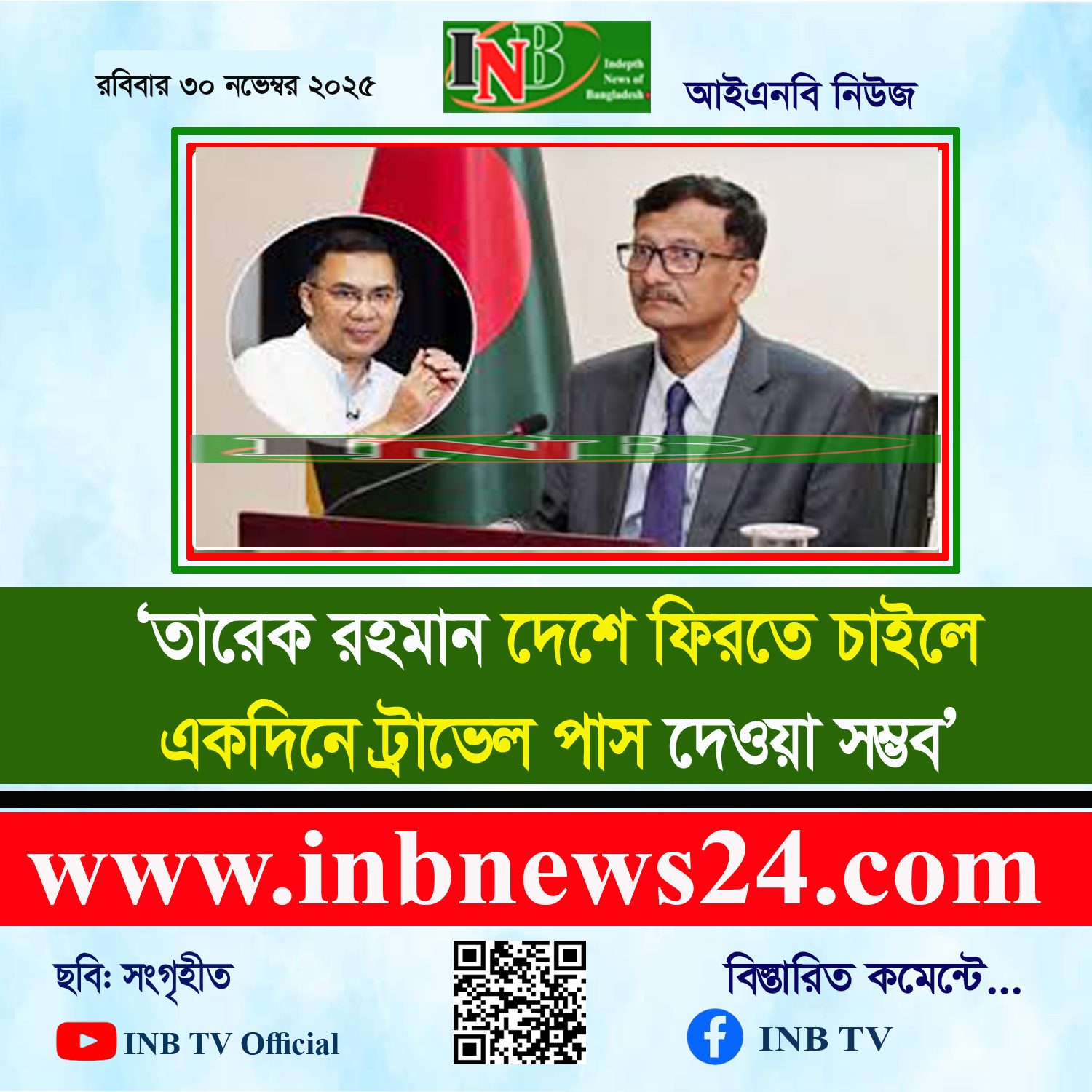 আইএনবি ডেস্ক: পররাষ্ট্র উপদেষ্টা মো. তৌ‌হিদ হোসেন জানিয়েছেন বিএনপির ভারপ্রাপ্ত চেয়ারম্যান তারেক রহমান দেশে আসতে চাইলে একদিনে ট্রাভেল পাস দেওয়া সম্ভব।