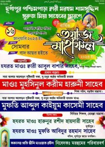 ব্রাহ্মণবাড়িয়া (নবীনগর) প্রতিনিধি: ব্রাহ্মণবাড়িয়ার নবীনগরের দুর্গাপুর গ্রামের পশ্চিম পাড়ার মরহুম ক্বারী শামসুদ্দিন (সুরুজ মিয়ার) স্মরণে এবং সকল কবরবাসীর আত্মার মাগফেরাত কামনায় তৃতীয় বাৎসরিক ওয়াজ ও দোয়ার মাহফিল করা হয়।