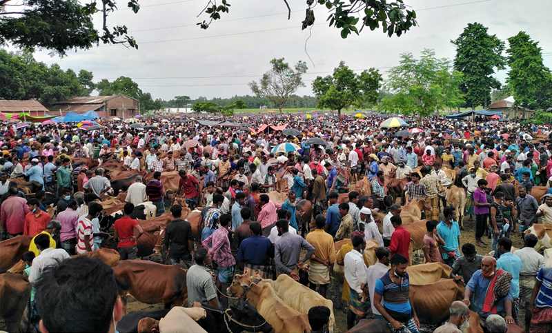 নওগাঁ প্রতিনিধি: নওগাঁর রাণীনগর উপজেলায় সরকার ঘোষিত চলমান কঠোর বিধি-নিষেধ উপেক্ষা করে গত ৮ জুলাই (বুধবার) সকাল থেকে হাট সবচেয়ে বড় পশুর হাট আবাদপুকুর বসছে। নওগাঁ জেলা প্রশাসকের পক্ষ থেকে গত শুক্রবার স্বাস্থ্যবিধি মেনে জেলার পশুহাট বসানোর ঘোষণা দেওয়া হয়। সেই মোতাবেক চলমান কঠোর লকডাউনের শেষ দিনে হাট বসেছে।