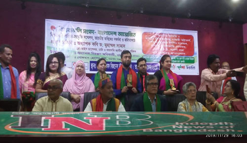 গত ২৯/১১/২০১৯ইং-শুক্রবার ঢাকা বিশ্ববিদ্যালয়ের সাহিত্য ও সাংস্কৃতিক সম্মেলন অডিটরিয়াম কক্ষে দুই বাংলার লেখকদের নিয়ে ঢাকা বিশ্ববিদ্যালয়ে আয়োজিত অনুষ্ঠানে আনুষ্ঠানিক ভাবে ঢাকা বিশ্ববিদ্যালয়ের প্রো ভাইস চ্যান্সেলর প্রফেসর ডক্টর মুহাম্মদ সামাদ এবং সাবেক সাংসদ ও উপমহাদেশে কাব্য শ্রী খ্যাত কবি কাজী রুজি এ সম্মাননা তুলে দেন।