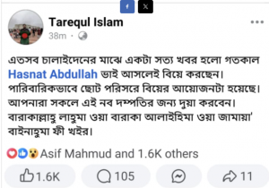 এ বিষয়ে তিনিও ফেসবুকে একটি পোস্ট দিয়েছেন। সেখানে তিনি লিখেছেন, এতোসব চালাইদেনের মাঝে একটা সত্য খবর হলো গতকাল হাসনাত আব্দুল্লাহ ভাই আসলেই বিয়ে করেছেন। পারিবারিকভাবে ছোট পরিসরে বিয়ের আয়োজনটা হয়েছে। আপনারা সবাই নবদম্পতির জন্য দোয়া করবেন।