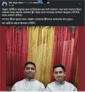 শনিবার (১২ অক্টোবর) দুপুরে ফেসবুকে হাসনাতের সঙ্গে নিজের ছবি পোস্ট করে সারজিস আলম লিখেছেন, ‘আল্লাহ পৃথিবীতে আমাদের জন্য যা দিয়েছেন তার সবই নেয়ামত৷ তার মধ্যে সবচেয়ে উত্তম নেয়ামত হচ্ছে একজন নেককার স্ত্রী ৷ আজ থেকে তুমি তেমনই একজন স্ত্রীর দায়িত্ব গ্রহণ করছ ৷ দাম্পত্য জীবন সুখের হোক ৷ আল্লাহ তোমাদের জীবনকে বরকতময় করে তুলুন৷ বিশেষ দ্রষ্টব্য: ভাবিকে এখনো আমরাও দেখিনি ৷’