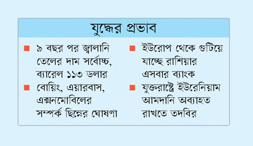 বোয়িং-এয়ারবাস, এক্সনমোবিল : বিশ্বের অন্যতম বিমান নির্মাতা প্রতিষ্ঠান বোয়িং রাশিয়ার অংশীদারদের সঙ্গে সম্পর্ক ছিন্ন করছে। গত মঙ্গলবার কম্পানিটি জানায়, তারা মস্কোর সঙ্গে সব কার্যক্রম স্থগিত করবে। মার্কিন বিমান নির্মাতা প্রতিষ্ঠানটি রাশিয়ার বিমানের জন্য আর প্রযুক্তিগত সহায়তা বা রক্ষণাবেক্ষণ বা যন্ত্রাংশ সরবরাহ করবে না। গত সোমবার কম্পানিটি কিয়েভের কার্যালয় এবং মস্কোতে পাইলট প্রশিক্ষণ কার্যক্রম বন্ধ করে।