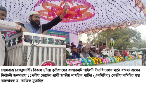 সোমবার (৯ফেব্রুয়ারী) বিকাল ৪টায় কুড়িগ্রামের রাজারহাট পাইলট উচ্চবিদ্যালয় মাঠে নির্বাচনী জনসভায় ১১দলীয় জোটের প্রার্থী জাতীয় নাগরিক পার্টির (এনসিপির) কেন্দ্রীয় কমিটির যুগ্ম আহবায়ক ড. আতিক মুজাহিদ বলেন, কুড়িগ্রামে একটা কুঠির শিল্প বানাবো। সেখানে মা-বোনরা কাজ করবে। মা -বোনের বানানো কাপড় বাইরে যাবে, ষেখানে লেখা থাকবে ‘মেড ইন কুড়িগ্রাম’।