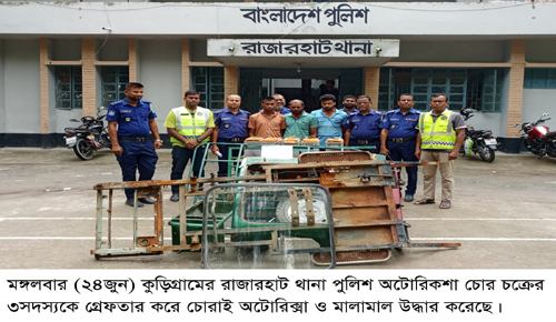 কুড়িগ্রাম প্রতিনিধি:কুড়িগ্রামের রাজারহাট থানা পুলিশ অটোরিকশা চোর চক্রের ৩সদস্যকে গ্রেফতার করে চোরাই মালামাল উদ্ধার করেছে। সোমবার(২৩জুন) গভীর রাতে উপজেলা শহরের বিভিন্ন জায়গায় অভিযান চালিয়ে তাদের গ্রেফতার করা হয়।