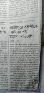এমডি বাবুল ভূঁইয়া: গাজীপুরের টঙ্গীর শিলমুন এলাকায় বিয়ের প্রস্তাবে রাজি না হওয়ায় জোর পূর্বক শ্লীলতাহানী করে সীমা আক্তার (১৫) নামে এসএসসি পরিক্ষার্থীনিকে হত্যা করার অভিযোগে মামলা হওয়ার দুই বছর অতিক্রম হলেও গ্রেফতার হয়নি আসামীরা।